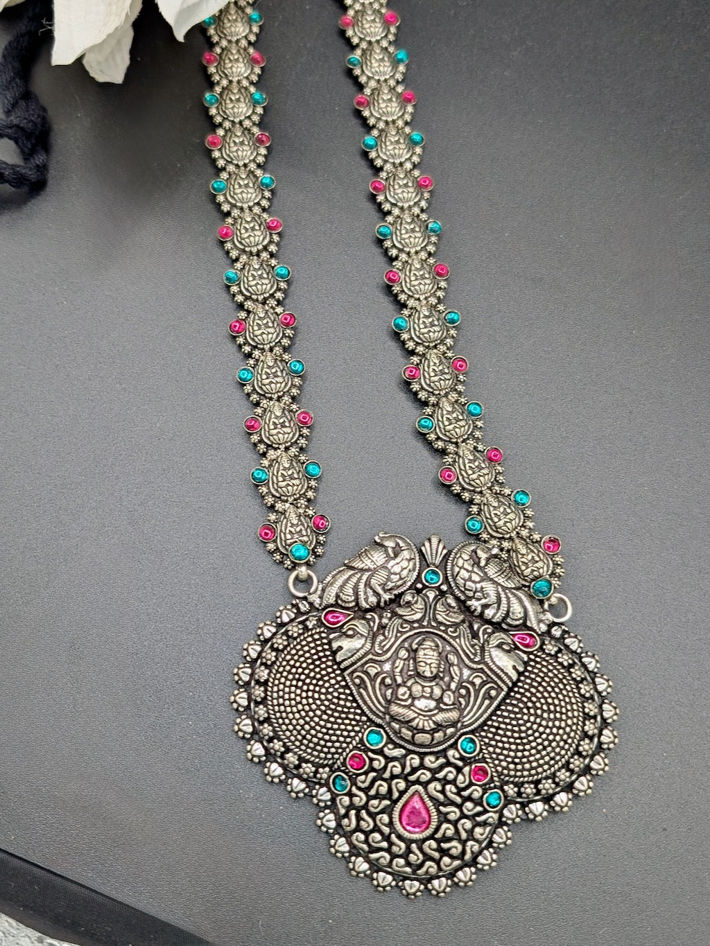 Elevate your ensemble with the Mugdha Long Kolhapuri Necklace, a stunning piece that showcases intricate craftsmanship. Its detailed design lends a timeless elegance, perfect for making a refined statement without the need for additional accessories. This necklace brings a touch of traditional charm with a sophisticated appeal, ideal for enhancing both casual and formal looks.