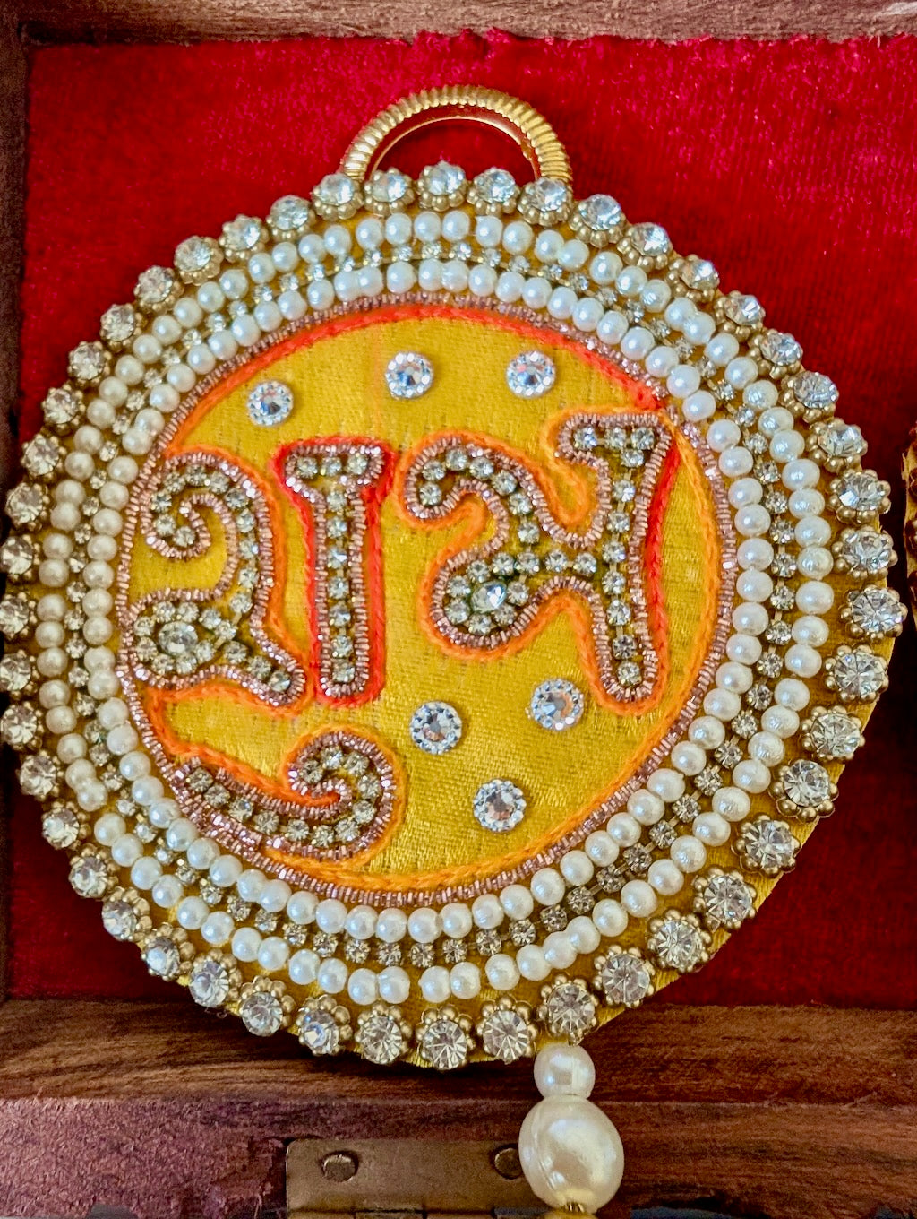 Elevate your décor with the Zardosi Shubh Labh Hanging, featuring intricate zardosi embroidery in radiant yellow embellished with pearls, shells, and subtle glitter. Measuring approximately 8 inches in length, this exquisite piece blends traditional craftsmanship with elegant charm, making it a refined addition to any space.